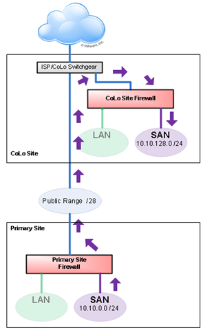 Most Collocations or Datacenters give you about 2 square feet to move around, (only a slight exaggeration on the truth) so it’s not the place you want to be contemplating reasons why something isn’t working. It’s also no fun realizing you don’t have the remote access you need to make the necessary modifications, and you don’t, or can’t drive to the CoLo. My plan for getting this second site running was simple. Build up everything locally (switchgear, firewalls, SAN, etc.) and change my topology at my primary site to emulate my the 2nd site.