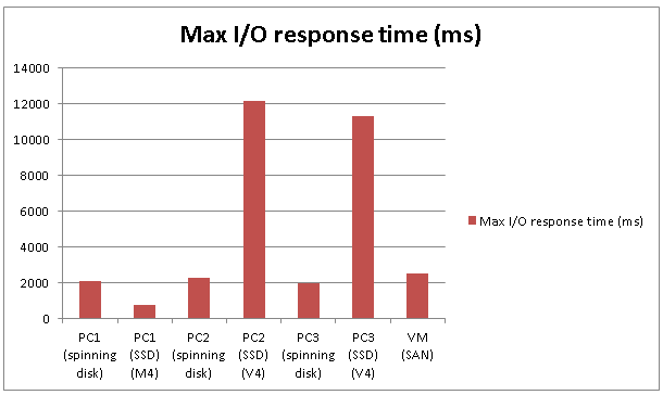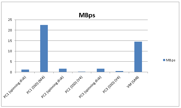 It didn’t take long to learn that that through a series of gaffes, what was ultimately ordered, delivered, and installed on those Developer workstations were not the Crucial M4 SSD drives that have such a good reputation, but the Crucial V4 drives. The complaints were quite startling. Code compile times increasing significantly. In fact, more than doubling over their spinning disk counterparts. When you have cries to bring back the 7200RPM SATA drives, there must be a problem. It was time to jump into the fray to see what was up. The first step was to simply verify that the disks were returning expected results.