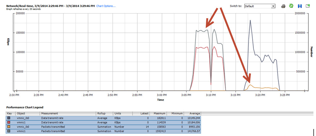 One of the first things that stood is illustrated below, with two 5 minutes test runs. Look at where the two arrows point. The arrow on the left points to the number of packets sent while using 1GbE. The arrow on the right shows the number of packets sent while using 10Gb InfiniBand. Quite a difference. Also notice that the effective throughput started out higher, but had to throttle back