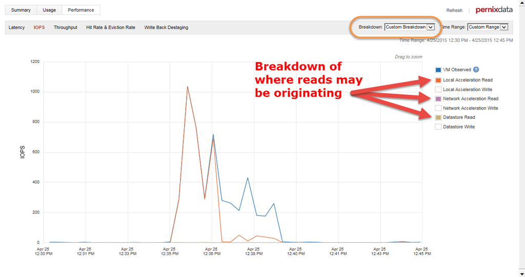 The desired result for the Latency tab is to have the “VM Observed” line as low and as consistent as possible. There may be times where the VM observed latency is not quite as low as you might expect. The causes for this are numerous, and subject for another post, but FVP will provide some good indications as to some of the sources of that latency. Switching over to the “Custom Breakdown” described earlier, you can see this more clearly. This view can be used as an effective tool to help better understand any causes related to an occasional latency spike.