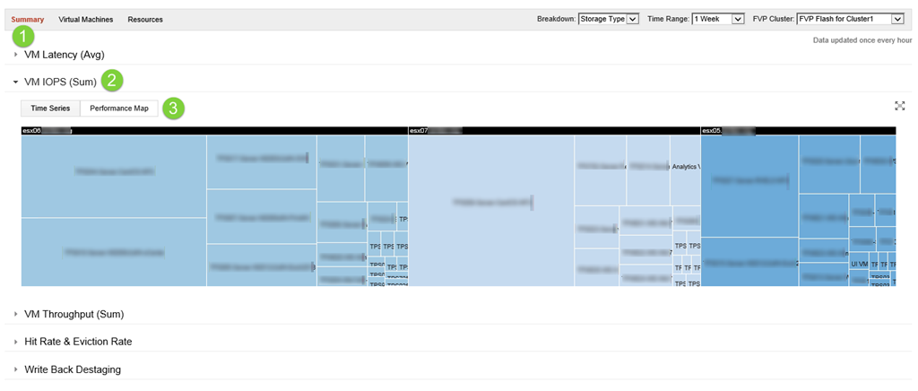 In order to quickly look for the busiest VMs, one can start at the top of the FVP cluster. Click on the “Performance Map” which is similar to a heat map. Rather than projecting VM I/O activity by color, the view will project each VM on their respective hosts at different sizes proportional to how much I/O they are generating for that given time period. More active VMs will show up larger than less active VMs.