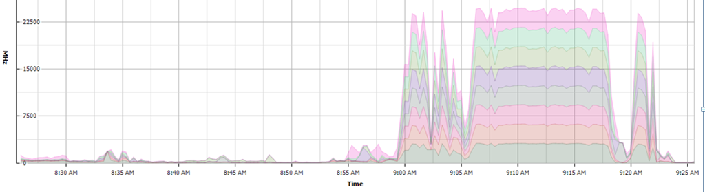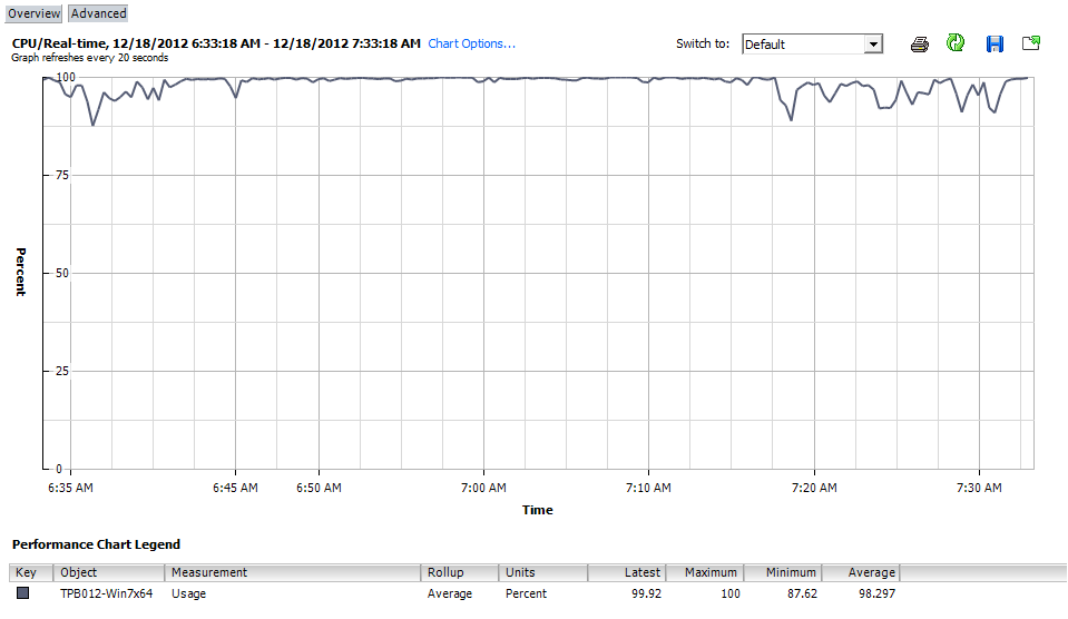 Each test run shows two graphs.  The Line graph shows total CPU utilization as a percentage, that is available to the VM.  The stacked line graph shows the number of CPU cycles in Mhz used by the given vCPU.