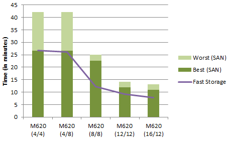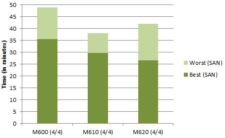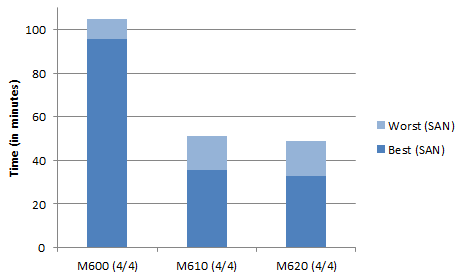 Yes, that is right.  The old M600 blades were that terrible when it came to running VMs that were compiling.  This would explain the inconsistent build time results we had seen in the past.  While there was improvement in the M620 over the M610s, the real power of the M620s is that they have double the number of physical cores (16) than the previous generations.  Also noteworthy is the significant impact the SAN (up to 50%) was affecting the end result.