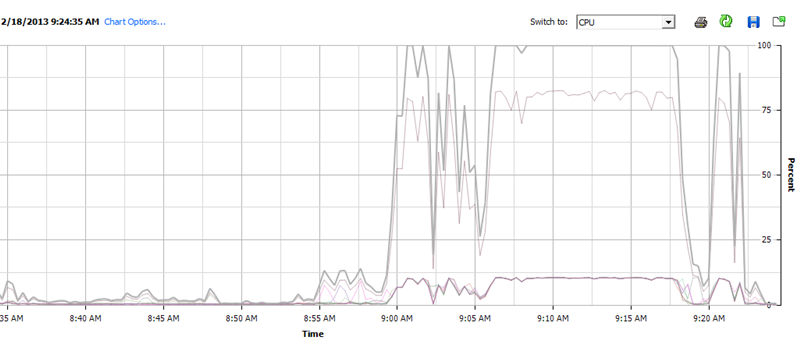 I knew storage was going to be an issue, but when contention occurs, its hard to determine how much of an impact it will have.  Think of a busy freeway, where throughput is pretty easy to predict up to a certain threshold.  Hit critical mass, and predicting commute times becomes very difficult.  Same thing with storage.  But how did I know storage was going to be an issue?  The free tool provided to all Dell EqualLogic customers; SAN HQ.  This tool has been a trusted resource for me in the past, and removes ALL speculation when it comes to historical usage of the arrays, and other valuable statistics.  IOPS, read/write ratios, latency etc.  You name it.